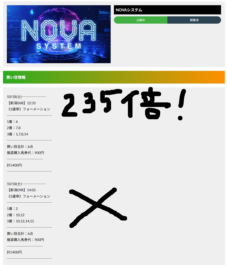 投稿者:さん先週の18.19日にNOVAという予想を初めて使いまして、土曜日新潟6レースで3連単235.7倍当たりまして21万2130円獲得できました!新潟9レースは不的中だったんですが、馬券代5400円だけなので結局20万以上利益として残り、大満足の結果でした!