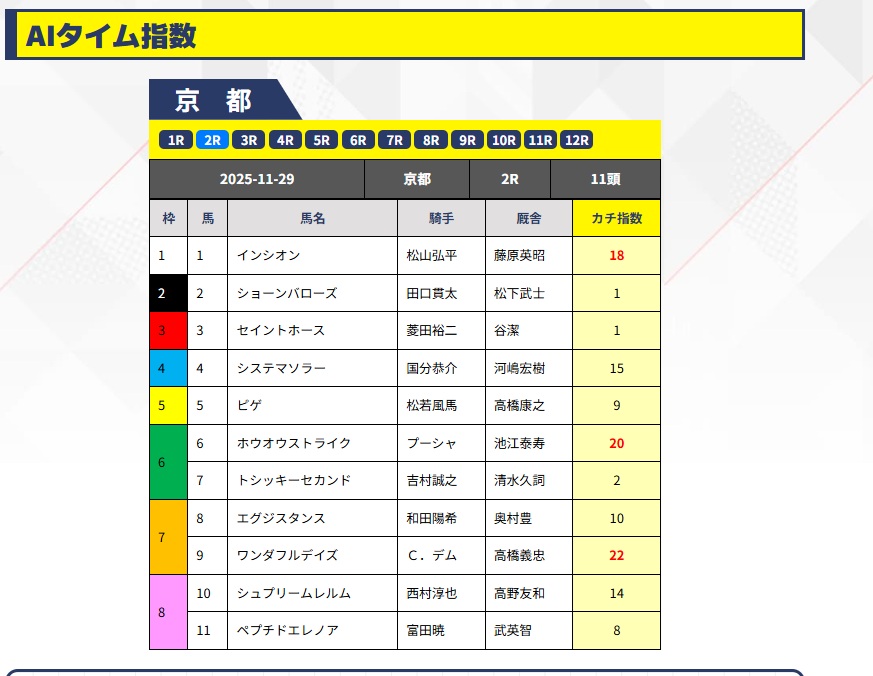 11/29土曜日、今日のAiタイム指数をチェック。京都1レース逃して2レースから使ったけど、さっそく的中。良い感じですね。あと10レースある笑 今週も勝ちます。