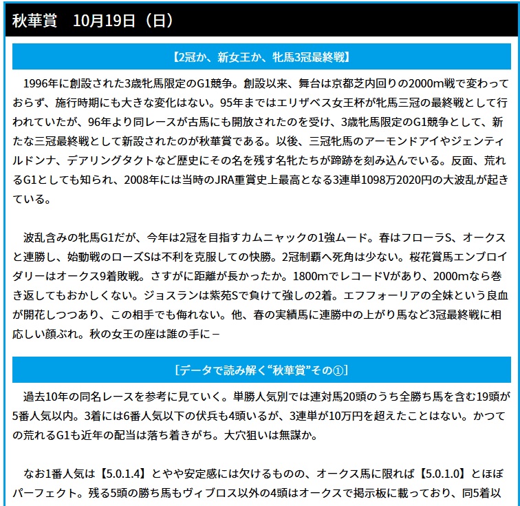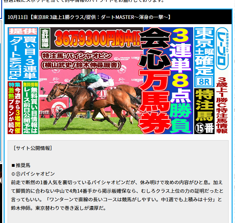 投稿者:さん週末の注目レースで秋華賞がピックアップされた。先週も先々週も俺はこの情報で馬絞れたし無料で見れるし、ほんと個人的に良い情報だと思ったのでお勧めします。重賞やる人は見た方が良いと思ってここに投稿させてもらいました。
