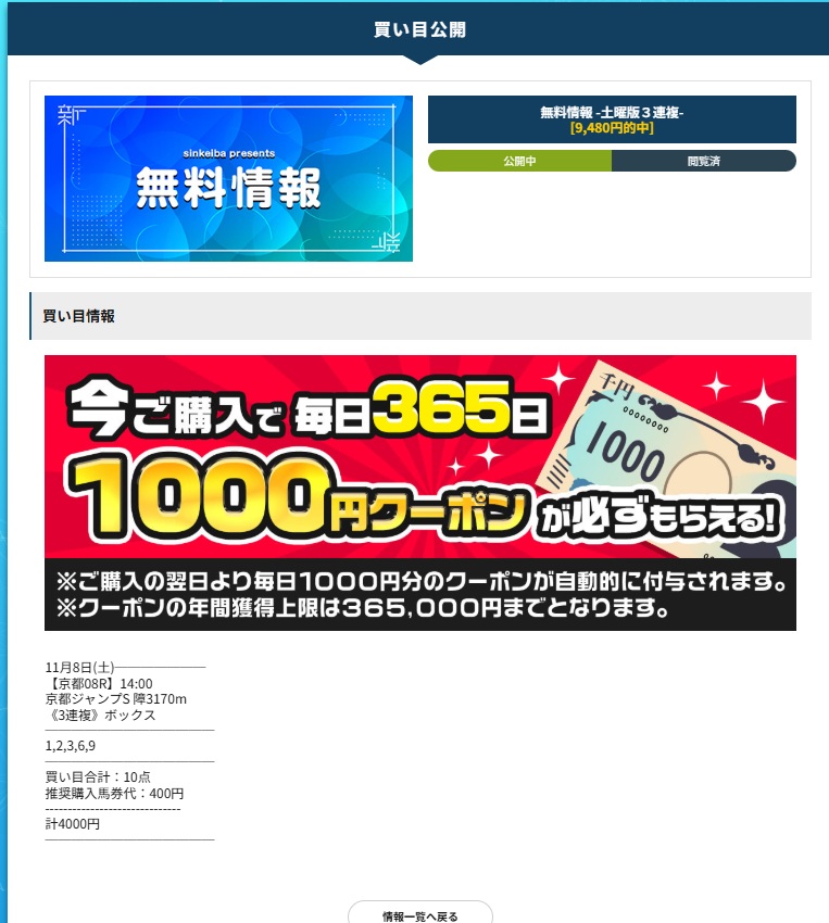 投稿者:さん【重賞専門の予想プランについて】他のサイトでも色々買ってきましたが、シンケイバでは重賞専門プランがありますね。私の個人的結果からの評価ですが、上位3社に入る予想精度。先週はチャンピオンズC3連単的中で36万7900円獲得。ラムジェットが3着となりましたが、4着のメイショウハリオ、5着のアウトレンジでさえもしっかりと抑えていたのは、素晴らしい予想でした。というより完璧でした。